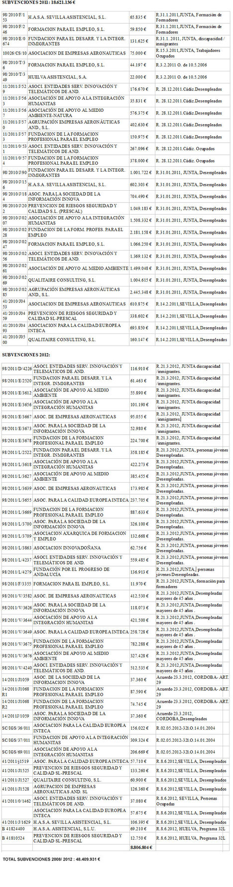 ASOCIACION DE APOYO A LA INTEGRACIÓN HUMANITAS -G 91761791-, constituida el 1/1/2009, domicilio c/Ebro,2, Sevilla, y que por Resolución de 30/1/2009, es decir, el mismo mes de su creación, y quizás sin estar aun inscrita y por supuesto, sin alta en SS, se le concede la primera subvención de 642.390€. Esto ya sería suficiente para intuir una cierta irregularidad. Desde luego, el criterio de la experiencia en formación -valorable para obtener la subvención- tampoco lo tenía en ese momento, pero es que ni siquiera existía jurídicamente en el periodo de la convocatoria.