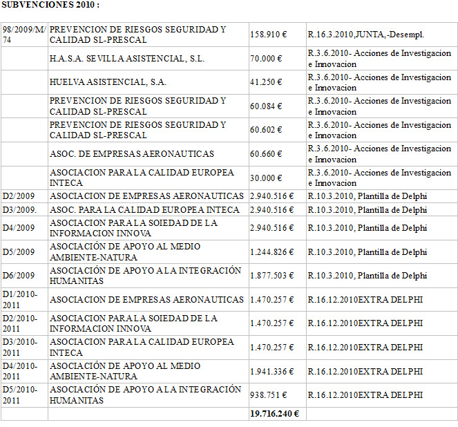 ASOCIACIÓN DE APOYO AL MEDIAMBIENTE – NATURA , G 91761734, constituida 1/1/2009, , domicilio en C/Ebro,2 Sevilla, dedicada a educación en general.Durante el año 2010 comienza el desarrollo de las instalaciones y de la estructura personal y material de estas empresas, con subvenciones por varios conceptos, de forma especial las correspondientes a realización de informes en la modalidad de "Acciones de Investigación e Innovación" -informes, estudios…- y las extraordinarias para la formación -y posterior recolocación - de los trabajadores de DELPHI.