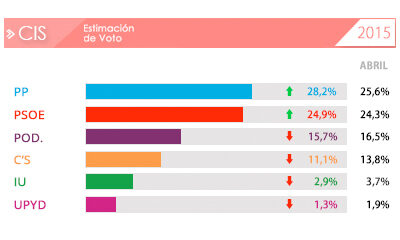Los datos del CIS refrendan los resultados de la mayoría de las encuestas publicadas desde las pasadas elecciones autonómicas y municipales y que señalan que los dos grandes partidos mantienen una tendencia al alza mientras que la de los dos aspirantes es a la baja.