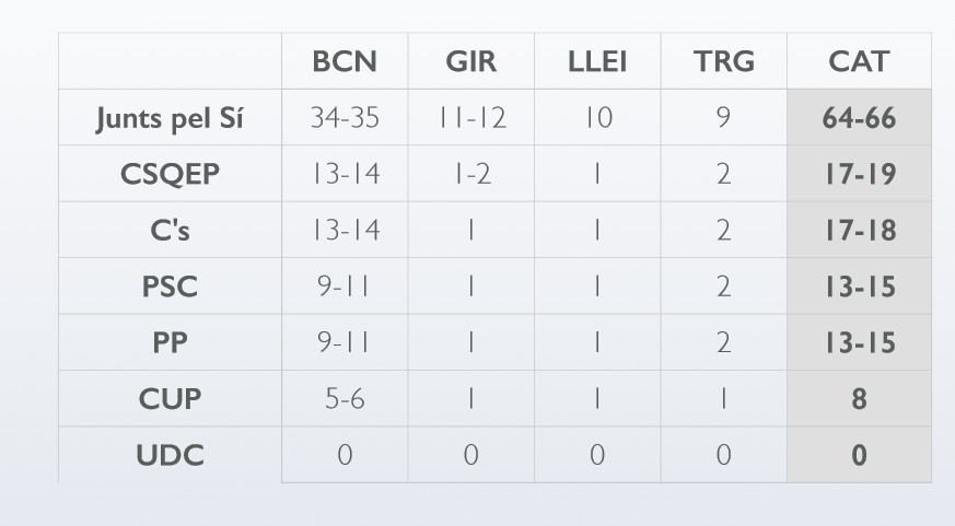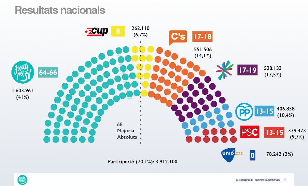 - Juntos por el Sí: 64-66 escaños 41%