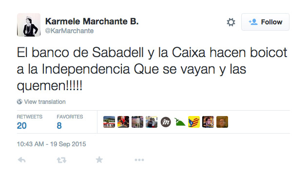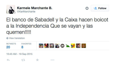 Lo ha hecho este sábado a través de su cuenta en Twitter con un mensaje directo: "El banco de Sabadell y la Caixa hacen boicot a la Independencia Que se vayan y las quemen!!!!!".