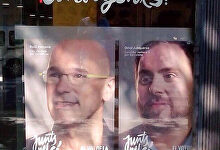 El principal inmueble embargado a CDC presenta en su escaparate los rostros del líder de ERC y del número uno de Juntos por el sí, pero no el de Mas.
