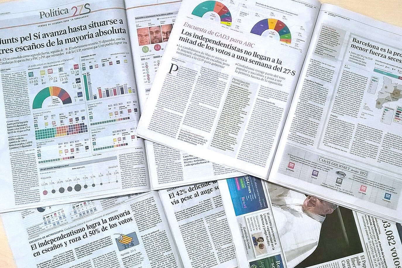Es el caso, por ejemplo, del sondeo que publica en su portada El País, y que ya adelantaba este sábado en su edición digital. Elaborada por Metroscopia la encuesta prevé que Juntos por el sí supere el 41% de los votos y se quede a sólo uno o dos escaños de mayoría absoluta, una mayoría que resultaría más que holgada con los 10 u 11 escaños que tendría la CUP gracias a su 8,4% del voto.