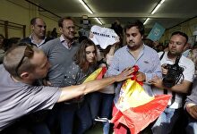 Un grupo de separatistas ha tratado de quitar de forma violenta una bandera de España a unos militantes de Vox durante el voto de Mas.