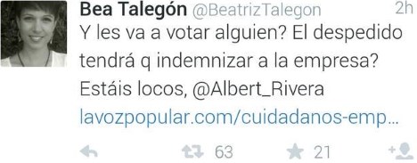 Beatriz Talegón, tertuliana y durante un breve tiempo esperanza de regeneración dentro del PSOE, ha calificado de "locos" a Ciudadanos y se ha preguntado si "les va a votar alguien". La razón es una noticia a la que enlaza, en la que se asegura que el partido de Albert Rivera estudia proponer que sea el despedido quien indemnice a la empresa y no al revés.