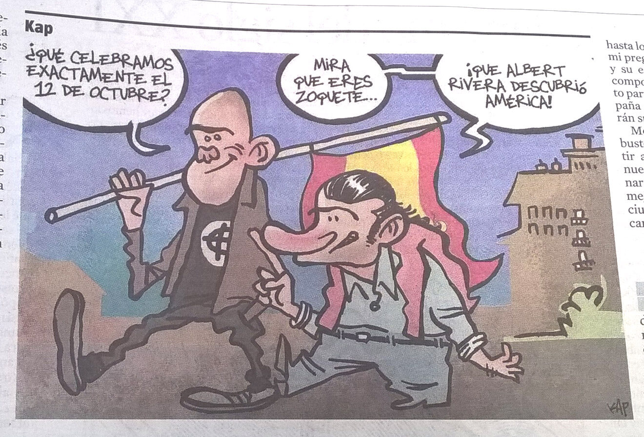 Lo peor, no obstante, es la conversación que mantienen: "¿Qué celebramos exactamente el 12 de octubre?", se pregunta el primero, a lo que el otro responde: "Mira que eres zoquete… ¡Que Albert Rivera descubrió América!".