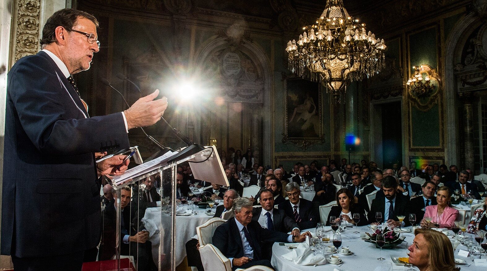 En paralelo, en el mismo lugar (la Carrera de San Jerónimo), el PP había montado un acto -catering incluido, con grifo de cerveza- para defender de sus logros con Sáenz de Santamaría como invitada estrella. "Frente a quienes nos critican por dónde estamos hay que poner en valor dónde hemos llegado", dijo la vicepresidenta a los suyos, subida en el atril. Si bien, a los periodistas, lo que les interesaba era su respuesta sobre Montoro: "Creo que es una entrevista sincera de una persona que ha trabajado mucho a lo largo de estos años para que en España se vuelva a crecer", contestó. Ana Pastor, Alonso e, incluso, Margallo trabajaron por cerrar la hemorragia. "Cristobal es un guasón (…) es una broma que acepto de muy buen grado", contestó el jefe de la diplomacia española.