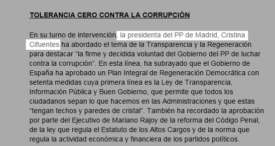 Cristina Cifuentes es la presidenta de la Comunidad de Madrid, pero no la del partido madrileño, cargo que ostenta Esperanza Aguirre desde 2004. Tras el resultado de las elecciones autonómicas y municipales en las que, pese a ser la fuerza más votada, no pudo formar gobierno en el Ayuntamiento de la capital, Aguirre pidió un congreso extraordinario en el que no se presentaría como candidata para renovar como presidenta del PP. No obstante, aún es la titular del cargo que los servicios de prensa del PP han atribuido, se supone que por error, a Cristina Cifuentes.