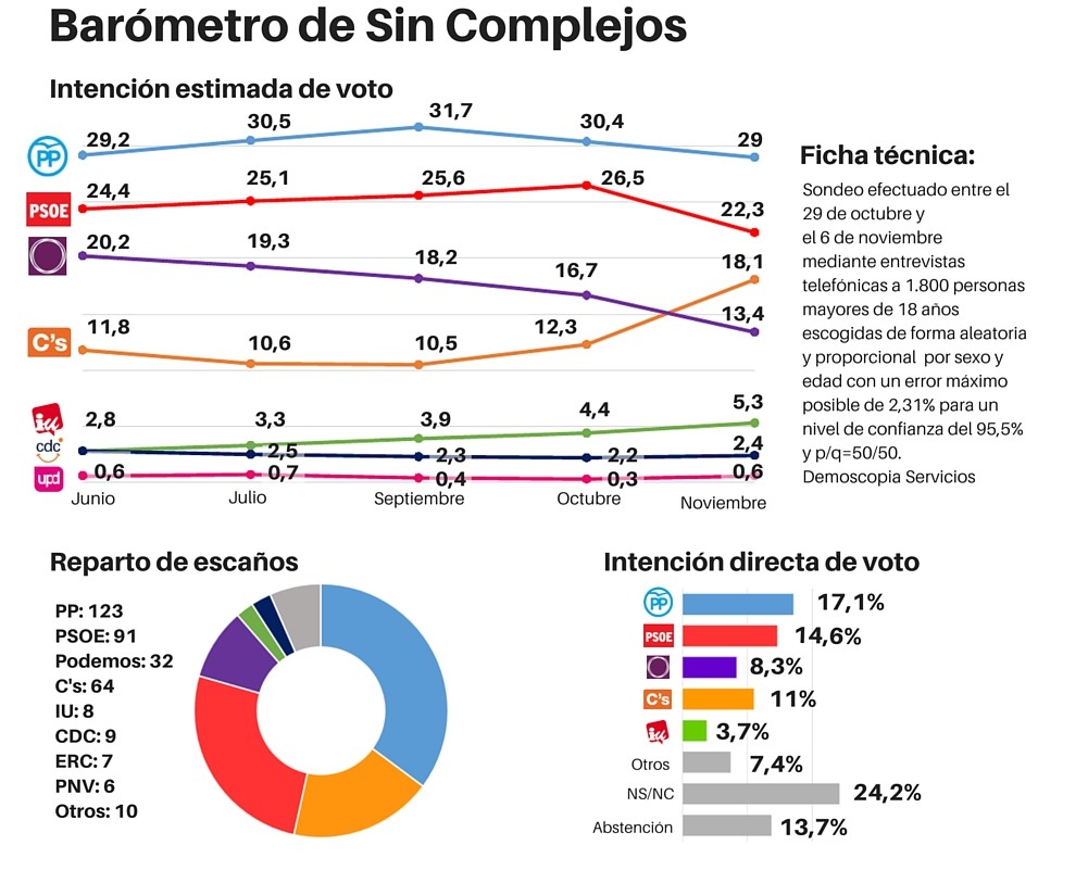El Partido Popular volvería a ganar las elecciones generales del próxima 20 de diciembre con el 29 por ciento de los votos, lo que le supondría un total de 123 escaños en el Congreso de los Diputados, según el barómetro elaborado por Demoscopia Servicios para Sin Complejos. Los populares descienden en intención de voto con respecto al sondeo del mes pasado, en el que obtenían un 30,4 por ciento de los votos y 139 escaños.