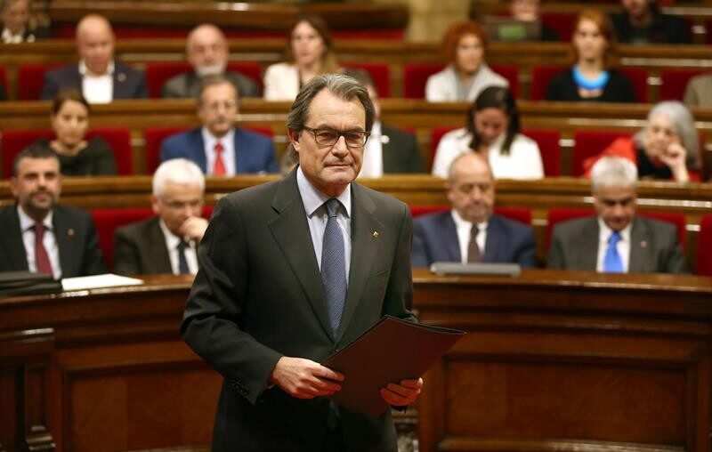 Cuatro horas después de la proclamación del "inicio del proceso constituyente del estado catalán independiente en forma de república", el presidente de la Generalidad en funciones, Artur Mas, emprendió un discurso de investidura en el que tras repasar la historia del proceso se sumó a las propuestas anticapitalistas de la CUP. Mas trató de justificar la insurrección parlamentaria con una nueva manipulación de las cifras de las pasadas elecciones autonómicas: "Se ha acabado el recurso a las mayorías silenciosas. Las urnas han hablado. Mayoría absoluta de los partidarios de la independencia, que casi llega al cincuenta por ciento. El cuarenta por ciento representa el no". A Mas se le olvidaron los votos de Podemos en Cataluña, partidarios de un referéndum, aunque con el matiz de que quieren que sea pactado con el Gobierno de España. Con esos cálculos se permitió calificar a España de "pseudodemocracia"."En las democracias de baja calidad, o en las pseudodemocracias se utilizan la fiscalía o la policía para responder a la legitimidad de las urnas", declaró.