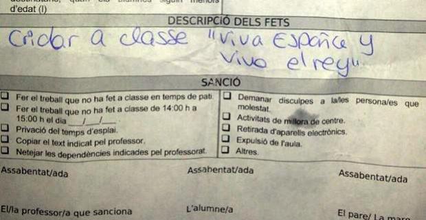¿Acaso hubiera actuado del mismo modo si el alumno hubiera ensalzado un "visca la republica catalana" o un "visca els paíssos cataláns"? ¿acaso está prohibido el ensalzar la figura de nuestro rey o de nuestro país?