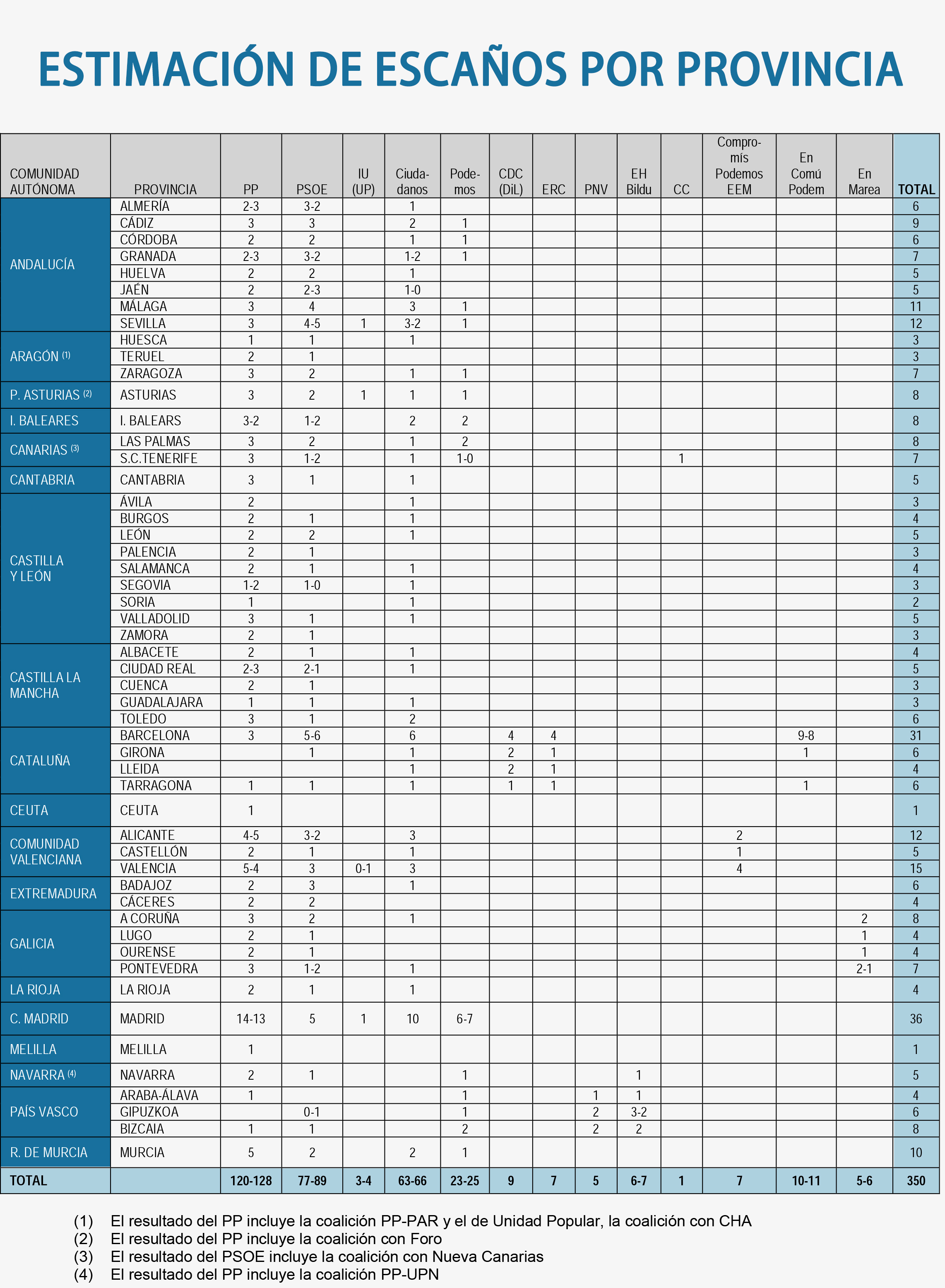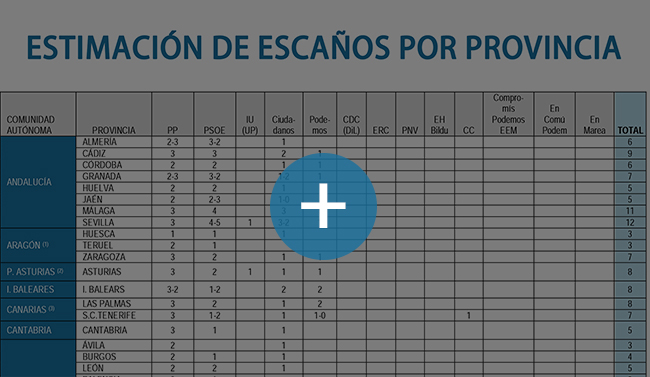 Una de las claves principales de este sondeo es que Ciudadanos entra en 39 de las 52 provincias (50 + Ceuta y Melilla). Sólo se quedaría fuera en Teruel, Palencia, Zamora, Cuenca, Ceuta, Cáceres, Lugo, Orense, Melilla, Navarra, Álava, Guipúzcoa y Vizcaya.