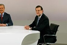 Pedro Sánchez y Mariano Rajoy ya están en la Academia de TV. Manuel Campo Vidal ha recibido a ambos candidatos a pie de coche y con paraguas.