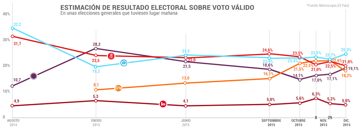 Desde prácticamente el pasado mes de junio las encuestas de Metroscopia que publicaba El País han venido hablando de un "triple empate técnico" entre PP, PSOE y Ciudadanos, con una muy ligera ventaja de los populares que incluso estaban por debajo de los socialistas en el sondeo de octubre.