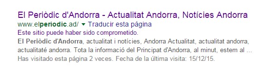 Cuando se realizaba una simple búsqueda en Google, el buscador ya nos advertía de que "este sitio puede haber sido comprometido". Fuentes de la filial andorrana de El Periódico confirman a LD que sufrieron un ataque hacker.