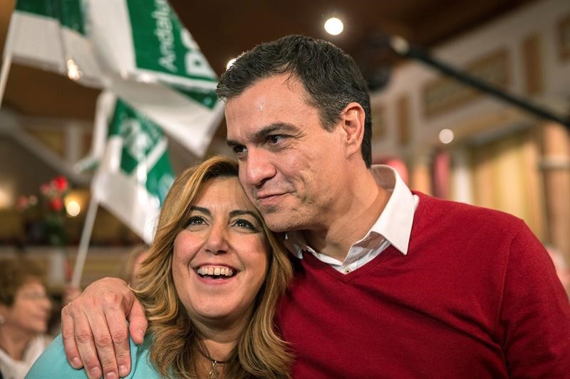 Su relación nunca ha sido tan afable... de cara a la galería. Nada ha cambiado en la enemistad interna que mantienen el secretario general del PSOE, Pedro Sánchez, y la presidenta de su federación más potente, Susana Díaz, salvo que ya no es manifiesta. Frente a los desplantes públicos que se hacían hace meses, este jueves llegaron a abrazarse en público al saludar a los asistentes. Lo que se considera normal, en el caso de Díaz y Sánchez, sólo lo es en campaña electoral y por la unidad forzada que exige el guión.