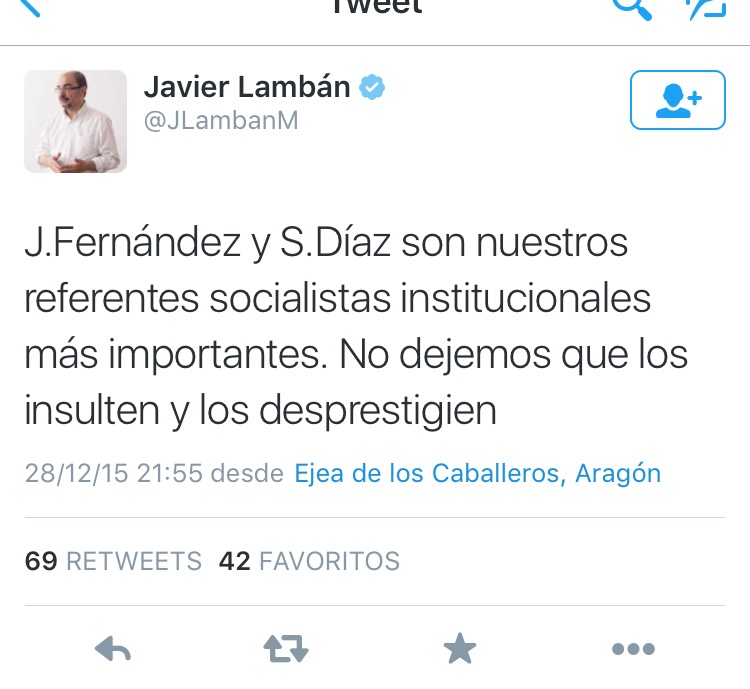 Más aún, cuando "no sería la primera vez" que se pospone un Congreso por el calendario electoral y de investidura, dijo añadiendo otra referencia velada, esta vez para Javier Fernández, el barón que pospuso seis meses su congreso regional por coincidir con el calendario electoral en Asturias. Unas referencias que motivaron un sonoro aplauso de los fieles de Sánchez presentes en la sala. No así de un ausente que según muchos "ha cambiado de chaqueta" en la última semana y ha pasado de ser uno de los apoyos territoriales más fieles de Pedro Sánchez a "hacerle el juego a Susana Díaz". Se trata de Javier Lambán, el barón y presidente de Aragón que no pudo acudir a la reunión del comité -sí lo hizo la noche anterior a la reunión de los barones en Ferraz-, y que dejó "sorprendida" a la dirección con este tuit en las redes sociales.