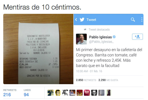 Sin embargo, pocas horas después y también a través de Twitter la "activista" Elena Alfaro revelaba que Iglesias, una vez más, miente: tal y como probaba con un ticket fechado este mismo lunes, el coste de idéntico desayuno en la facultad es de 2,35 euros, diez céntimos más barato que en el Congreso.