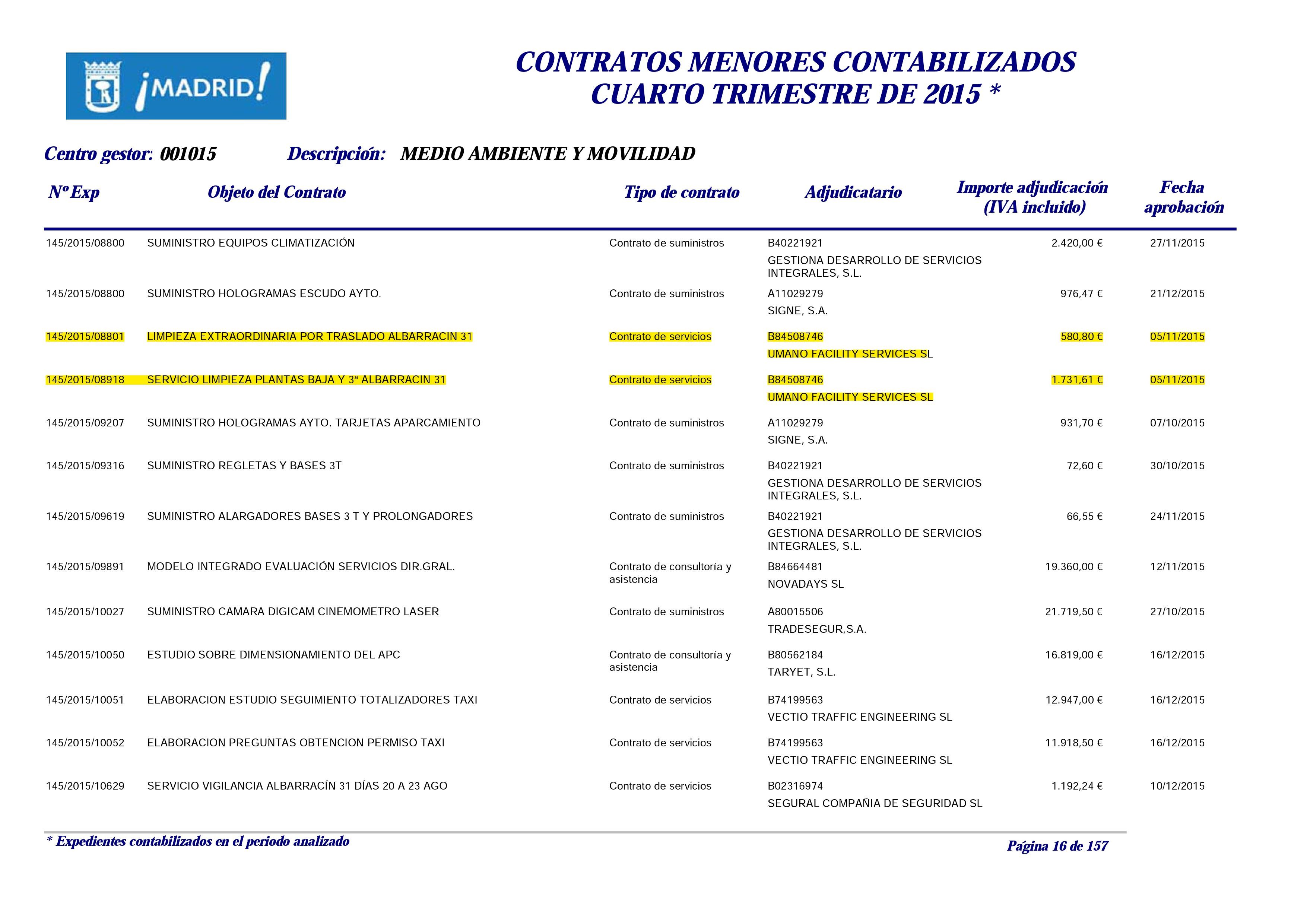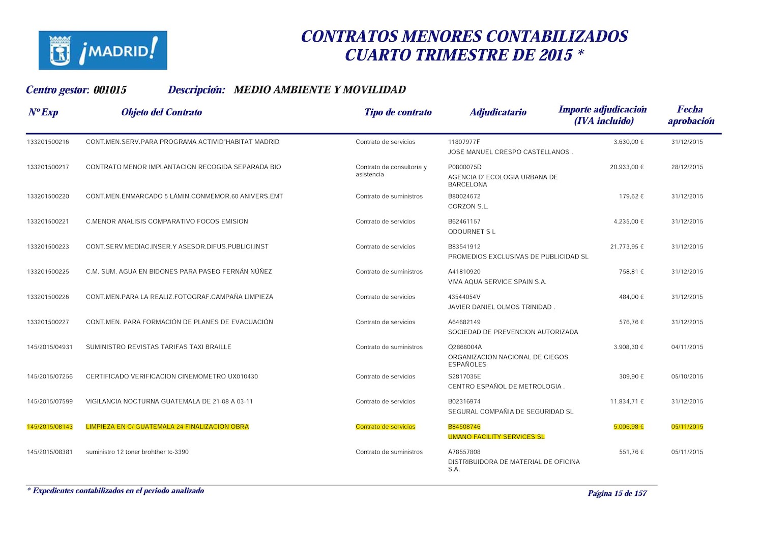 En total, son 3 contratos menores por valor 7.319,39 euros suscritos el 5 de noviembre de 2015. Además, hay un cuarto contrato de 21.549 euros con fecha de 21 de diciembre. Sin embargo, éste comprende el servicio prestado por la empresa desde el 1 de marzo pasado, cuando todavía era alcaldesa Ana Botella, hasta el 30 de noviembre de 2015.