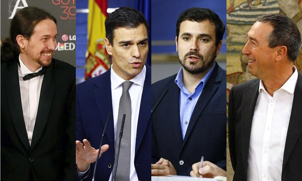 Según el comunicado IU-Unidad Popular del que se hace eco Europa Press, el diálogo a cuatro sobre un hipotético pacto que facilite la investidura de Pedro Sánchez como presidente del Gobierno para la legislatura tendrá lugar este lunes por la tarde, depués de que las otras tres formaciones participantes hayan aceptado la propuesta que el portavoz parlamentario de IU-UP, Alberto Garzón, hizo a los otros tres partidos el pasado jueves..