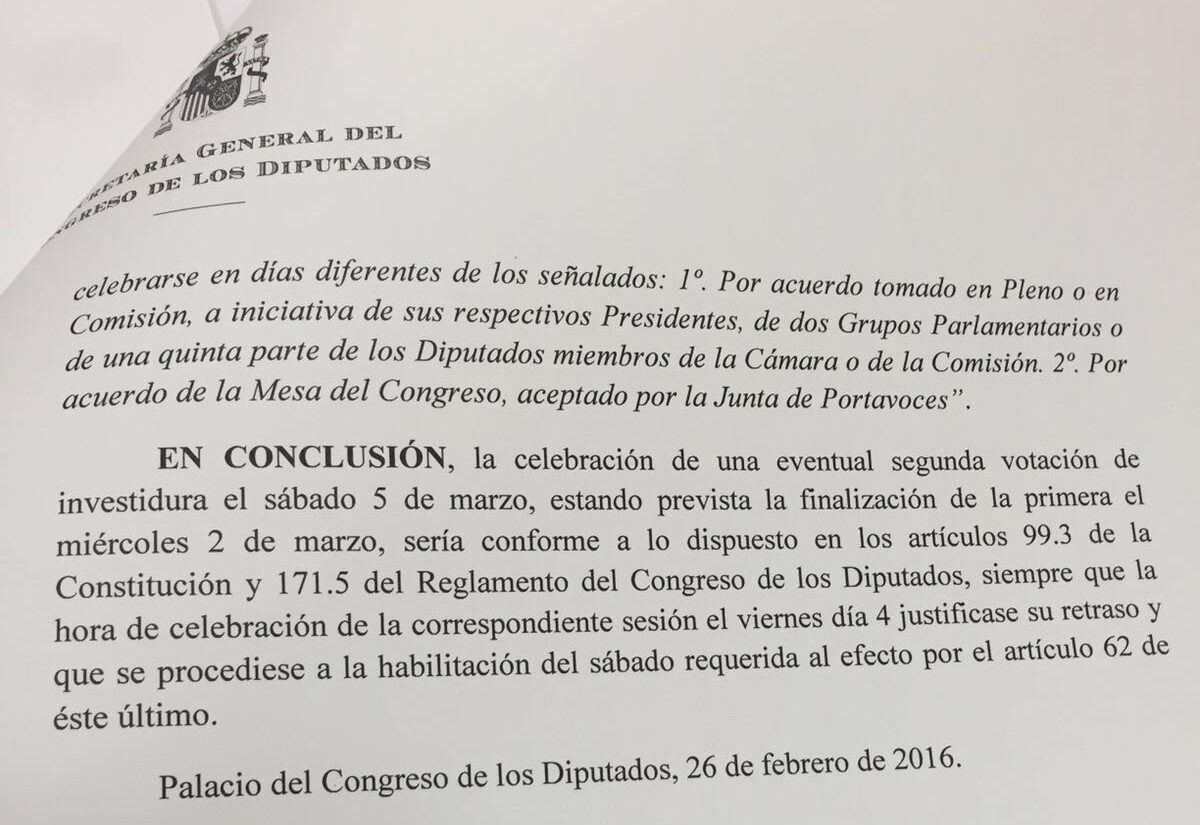 Según las fuentes consultadas por LD, López justifica en el citado documento su decisión inicial "conforme a lo dispuesto en los artículos 99.3 de la Constitución y 171.5 del Reglamento del Congreso". Fuentes de la presidencia aseguran también a este diario que "el informe de los letrados avala al presidente".