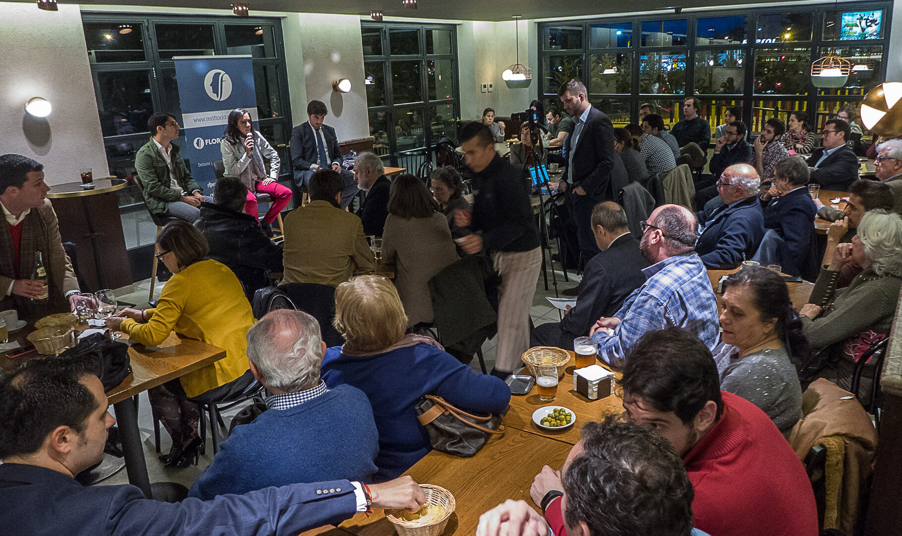 Al entrar en la cafetería en la que se ha convocado el acto encontramos a unas 70 personas a las que aún se han de unir unas pocas más que harán que al final seamos cerca de un centenar desbordando el aforo del local: algunos tienen que quedarse de pie. Hay gente de todas las edades, no todos son jóvenes yuppies, aunque tampoco se ven rastas. En general, el aspecto es el que podríamos esperar de una reunión de militantes del PP.