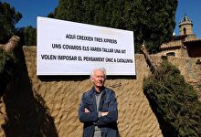 Albert Boadella junto al cartel que ha colocado en el lugar donde fue atacada su casa | EFE