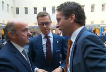 Las cámaras han captado cómo el presidente del Eurogrupo buscaba al ministro español De Guindos para interesarse por la situación en España.