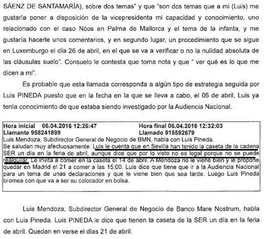 Precisamente, es en el sumario que se instruye contra el presidente de Ausbanc donde encontramos esta revelación, concretamente en la conversación que Luis Pineda sostiene con Luis Mendoza, subdirector general del Banco Mare Nostrum, conversación que fue intervenida y grabada por orden judicial el día 6 de abril de este año.