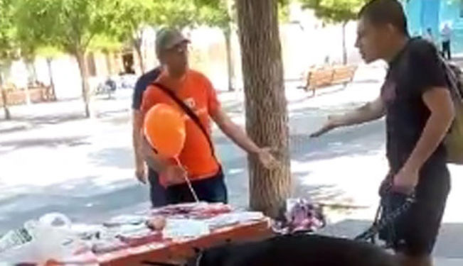 Un energúmeno que paseaba con su perro por el madrileño barrio de Vallecas golpeaba la mesa informativa de Ciudadanos, insultando a los simpatizantes de la formación naranja.