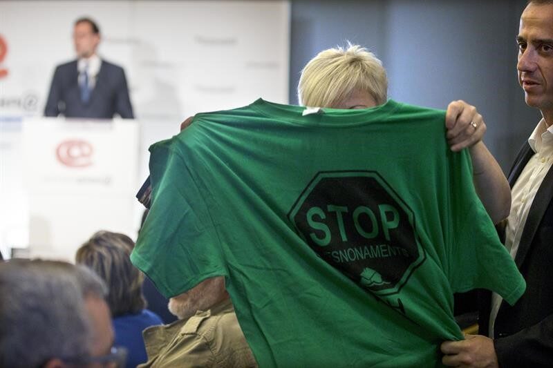 Dos miembros de la PAH-la Plataforma de Afectados por la Hipoteca se colaron en el desayuno informativo de Mariano Rajoy en Barcelona, organizado por El Periódico. Se sentaron como unos invitados más al acto, esperaron a que el presidente en funciones empezar a hablar, y se levantaron con sus típicas camisetas verdes. Primero una mujer, después un hombre, que criticó los desahucios. El equipo de seguridad les invitó a que se marcharan.