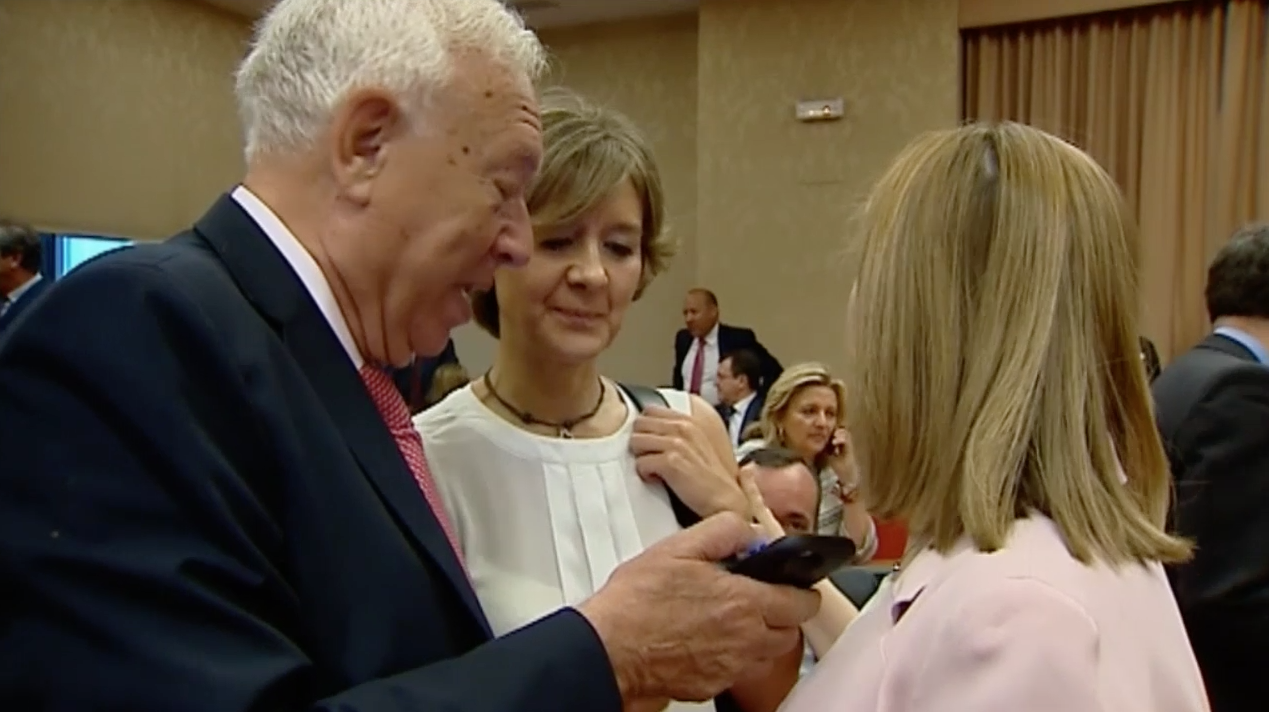 Las cámaras de televisión grabaron cómo el ministro José Manuel García-Margallo enseñaba un mensaje enviado por Albert Rivera a Isabel García Tejerina y Ana Pastor
