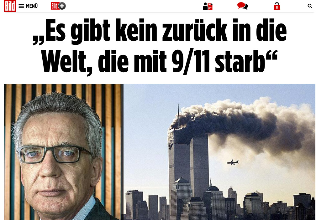 "Nadie puede regresar al mundo que murió con los atentados contra el World Trade Center y el Pentágono. La historia no se puede revertir", afirmó De Maizière, quien dijo que no obstante no hay que olvidar que el terrorismo ya existía antes del 11-S.