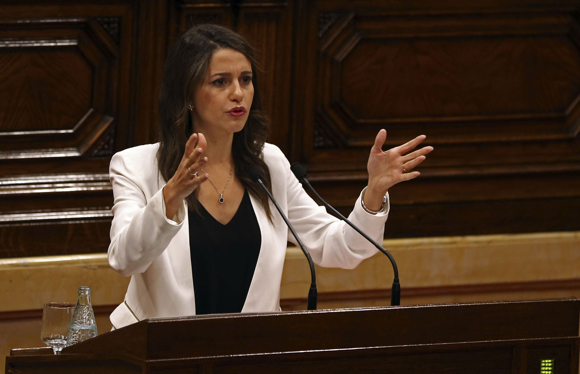 En un tono amable, casi cordial, la presidenta de Ciudadanos y jefa de la oposición en el parlamento catalán, Inés Arrimadas, contestó a los argumentos expuestos el miércoles por el presidente de la Generalidad, Carles Puigdemont, con la imagen de una bicicleta estática, comparación sobre el proceso que enervó a la bancada separatista. Aún más, hurgó en las contradicciones de Junts pel Sí, que ha pasado de considerar el referéndum una "pantalla superada" a enabolarlo de nuevo, diciendo que tal estrategia era como la rueda de un hámster. "Vuelven a la casilla de salida y meten y sacan del cajón el referéndum según les conviene. Más que un referéndum es 'neverendum'", añadió la diputada.