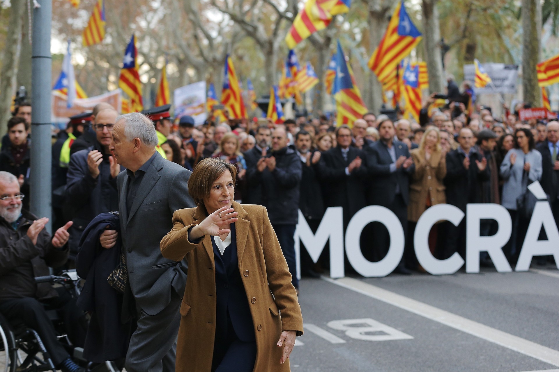 Forcadell ha sido arropada y acompañada hasta el TSJC, que dista unos quinientos metros del parlamento catalán, en el mismo paseíllo que se organizó para Mas, por un gentío en el que destacaban el presidente de la Generalidad, Carles Puigdemont, el vicepresidente, Oriol Junqueras, alcaldes y diputados separatistas de todos los partidos.