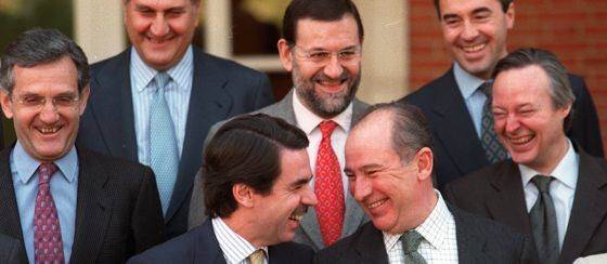 Mariano Rajoy sonríe en la foto de familia a las puertas de la Moncloa en el comienzo del segundo mandato de José María Aznar como presidente del Gobierno en el año 2000. En aquel momento, Rajoy era vicepresidente del Gobierno, puesto que ocupó durante tres años
