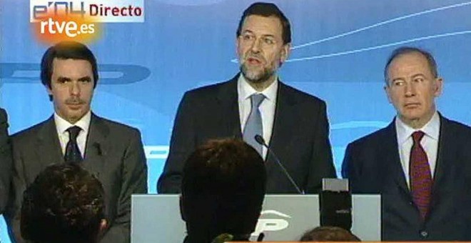 Mariano Rajoy, en una imagen en directo en TVE entre José María Aznar y Rodrigo Rato, durante su discurso admitiendo su derrota en las elecciones generales de 2004, tres días después de los atentados del 11-M en Madrid