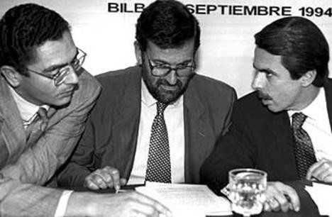 José María Aznar, Mariano Rajoy y Alberto Ruiz Gallardón durante una reunión de parlamentarios del PP en septiembre de 1994 en Bilbao