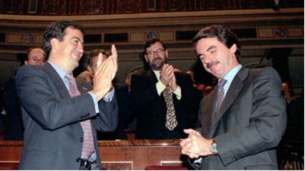 Francisco Álvarez Cascos y un joven Rajoy aplauden a José María Aznar en 1996, durante la investidura de Aznar como presidente del Gobierno