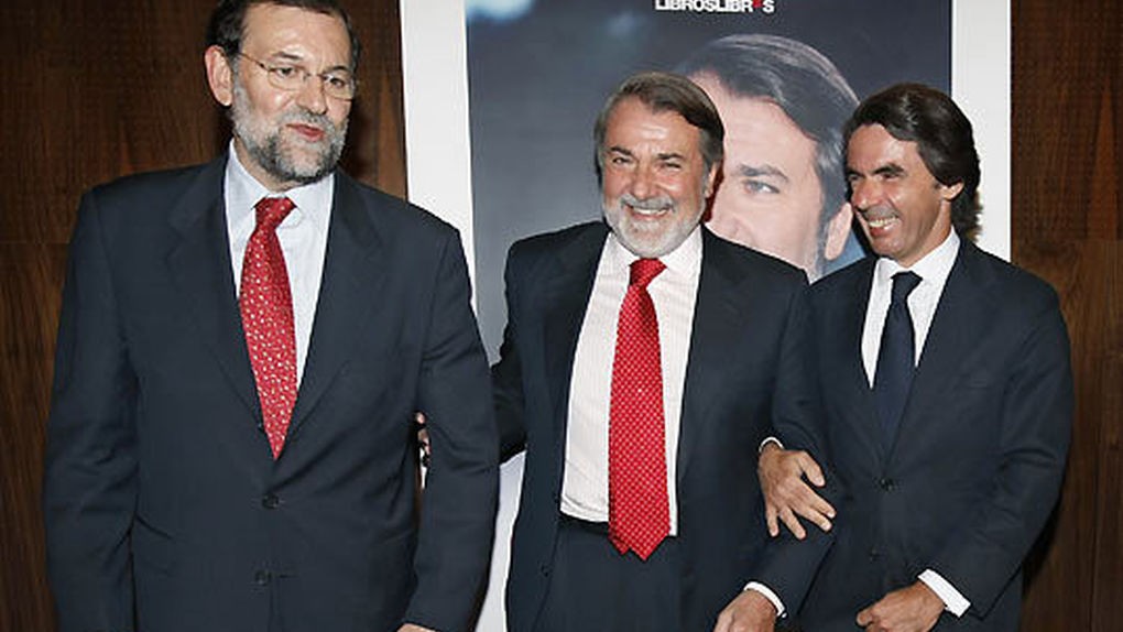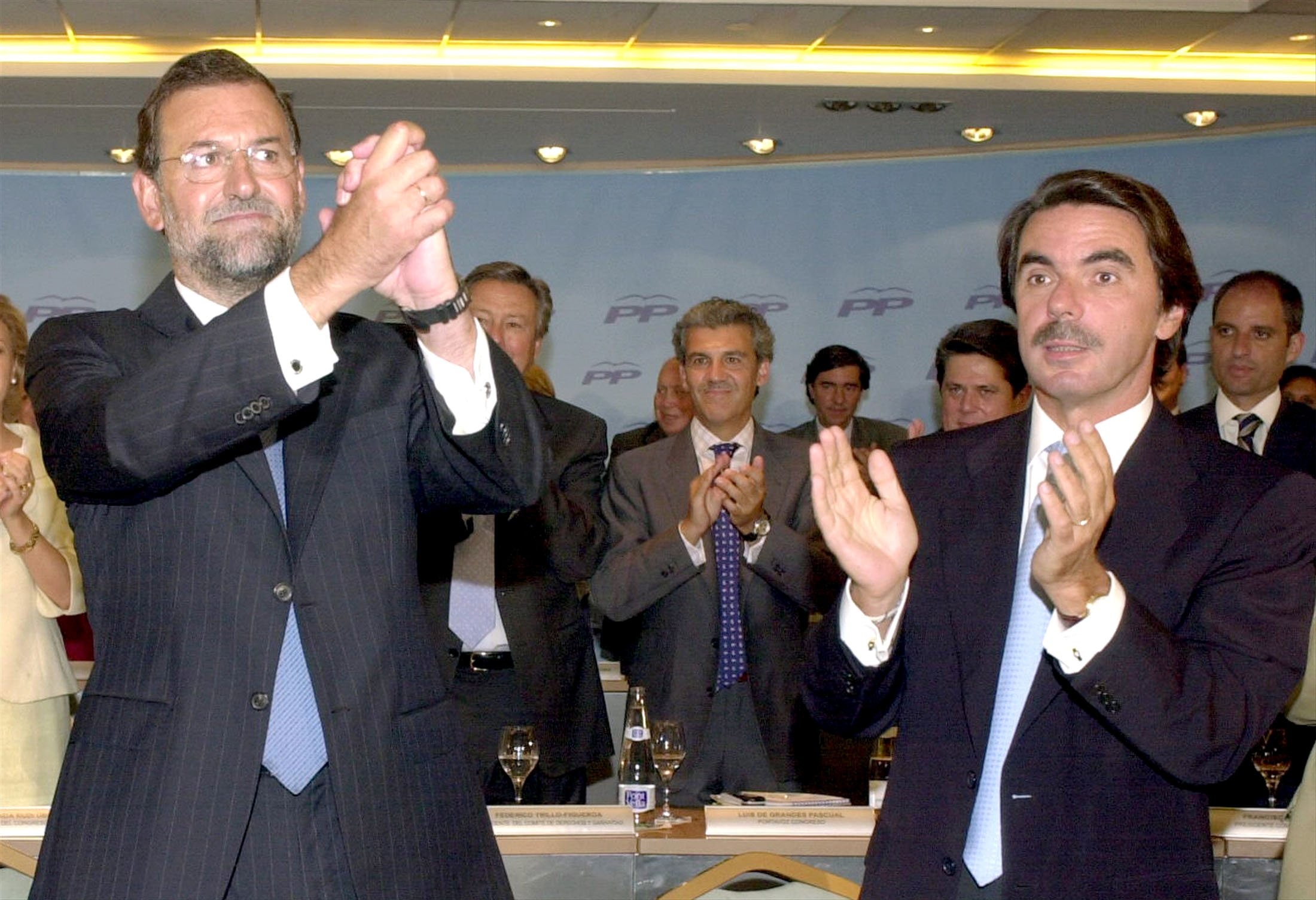 Aznar pasa la mano por el hombro a Mariano Rajoy en presencia de Manuel Fraga durante el 16 congreso nacional del PP en Valencia, el congreso en el que Mariano Rajoy cambió el rumbo del PP tras pedir a “los liberales” que se fueran del partido. “Si alguien quiere irse al partido liberal o al conservador, que se vaya”, dijo unas semanas antes de que arrancara el congreso. Aznar fue especialmente duro con Rajoy en su discurso de aquel cónclave