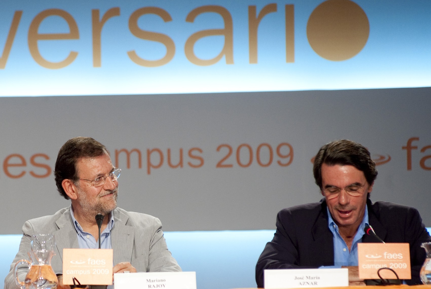 Mariano Rajoy y José María Aznar, un año después de aquel Congreso celebrado en Valencia, durante el acto de inauguración del Campus FAES en 2009