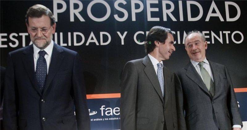 José María Aznar y Rodrigo Rato, conversan junto a Mariano Rajoy durante un acto de la fundación FAES en 2011