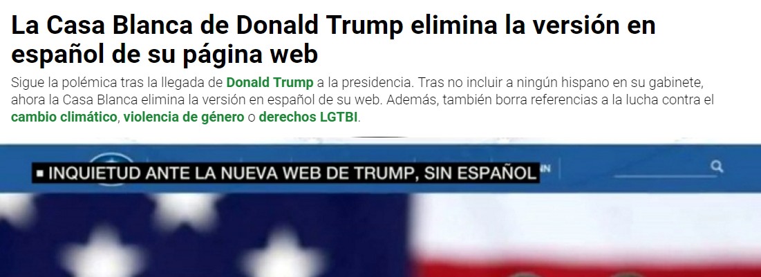 Vestiduras rasgadas, gritos en el cielo, exclamaciones en Twitter. La aparente decisión de Donald Trump de eliminar la versión en español de la web de la Casa Blanca (que contaba con cuatro años de vida) ha molestado mucho. Tanto que el Gobierno español, a través de sus titulares de Exteriores o de Justicia Alfonso Dastis y Rafel Catalá, han lamentado esta decisión y lo han calificado de mala noticia.