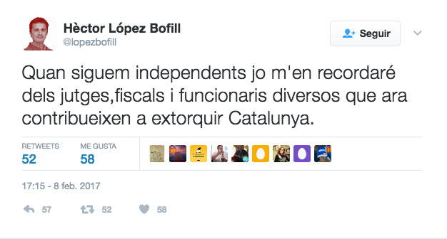 El mensaje de López Bofill fue: "Cuando seamos independientes yo me acordaré de los jueces, fiscales y funcionarios que contribuyen a extorsionar Cataluña". Así pues ya no harán falta las listas de jueces y juristas adictos al nuevo régimen republicano que había elaborado el exjuez y exsenador de ERC Santi Vidal en colaboración, según dijo, con la consejería de Justicia de la Generalidad que dirige Carles Mundó. De la contestación de López Bofill se deduce que tras la proclamación de la independencia se presentará voluntario y armado de su celo y memoria para señalar a los "extorsionadores".