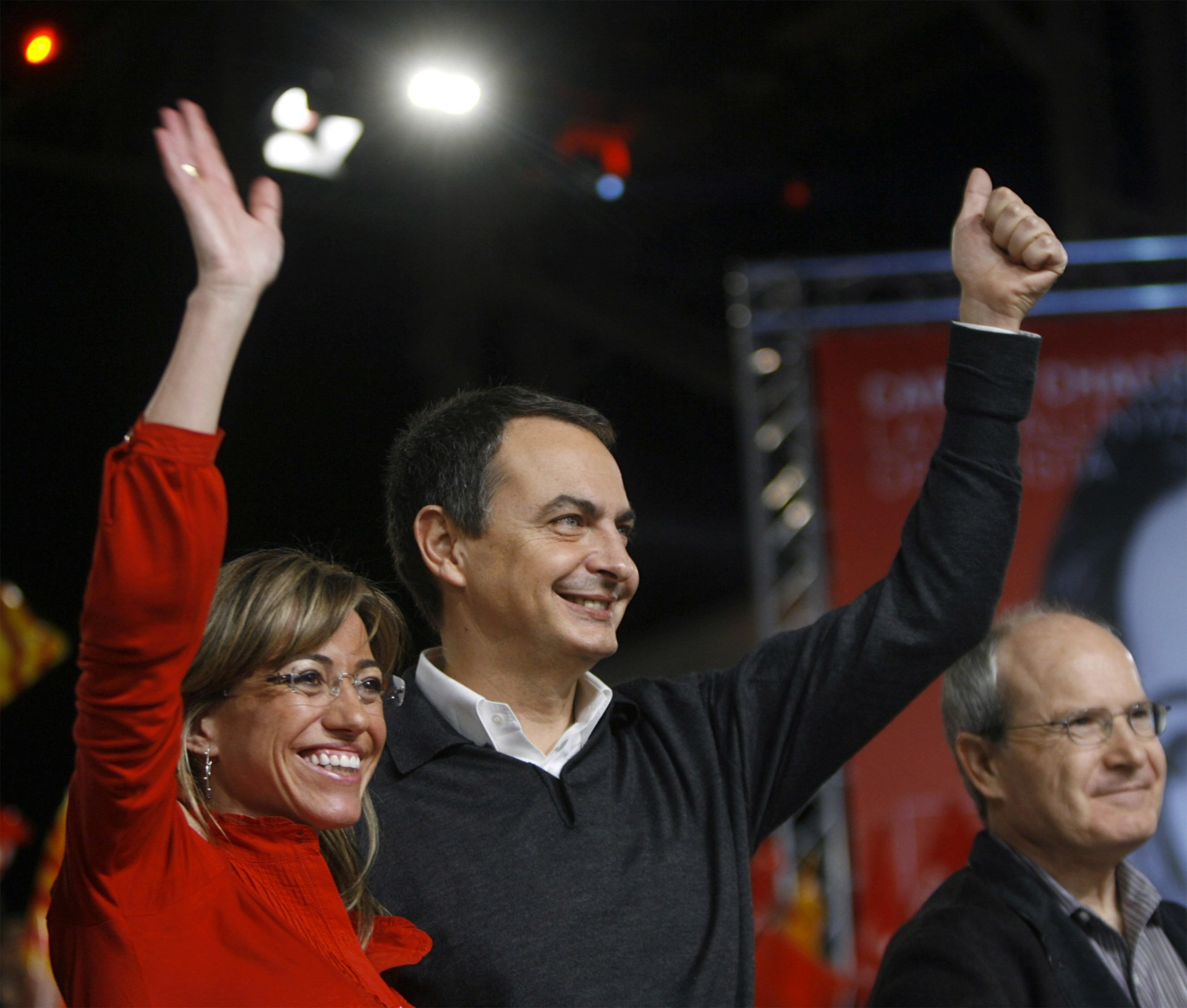Chacón, con Zapatero y Montilla en la campaña de las elecciones de 2008. En aquella ocasión fue número 1 del PSOE por Barcelona y obtuvo un gran resultado en toda Cataluña, esencial para el triunfo socialista