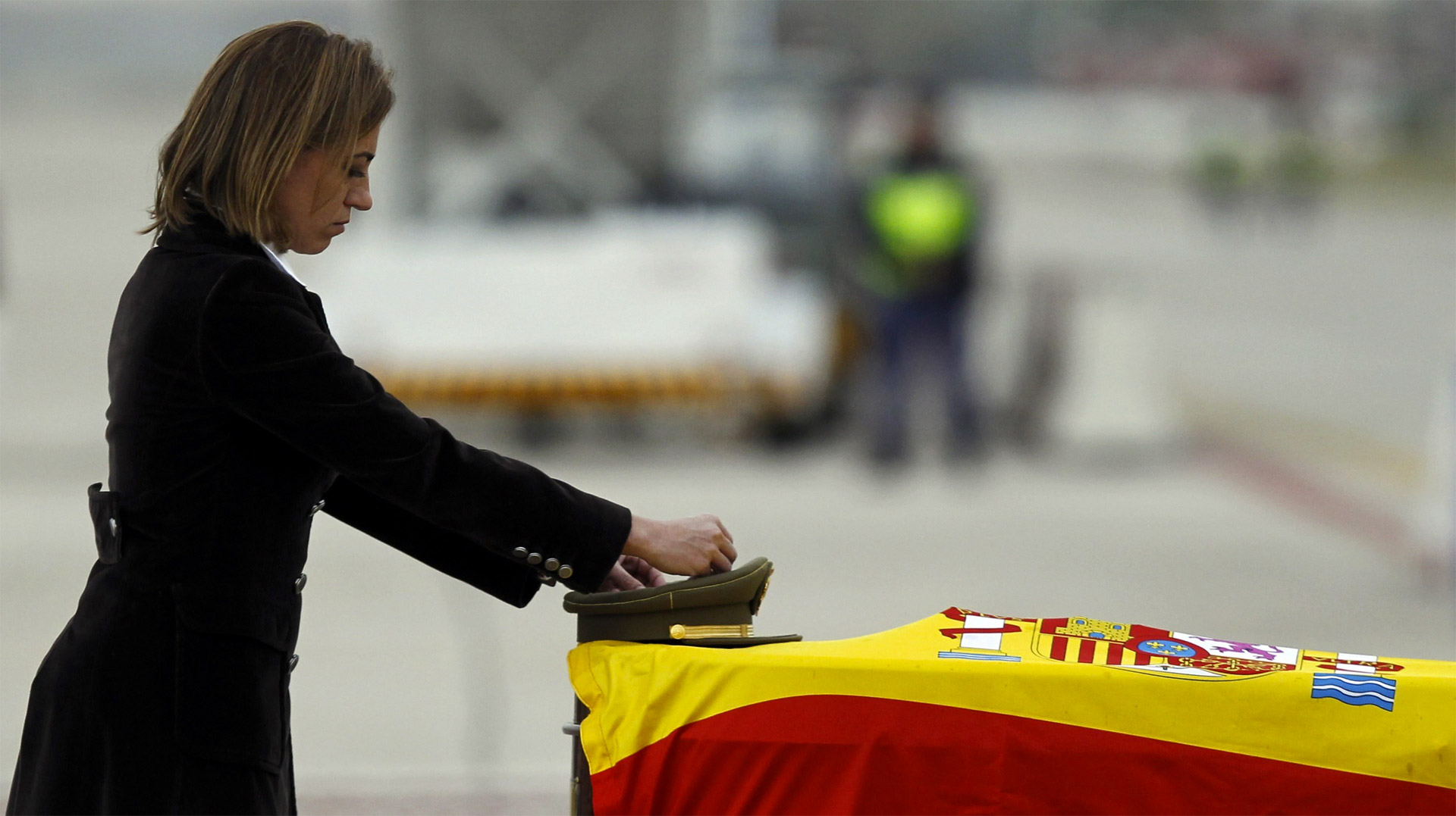 El lado más difícil del Ministerio de Defensa: Chacón impone la Cruz del Mérito Milital al féretro del sargento Joaquín Moya, fallecido en Afganistán.