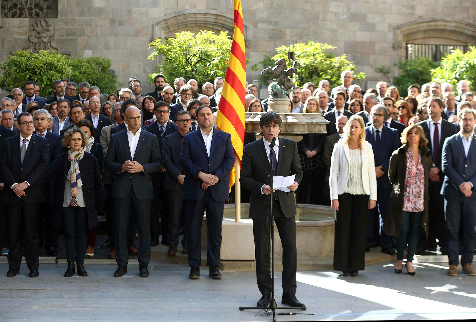 El presidente de la Generalidad, Carles Puigdemont, ha presidido el acto de unidad celebrado a las diez de la mañana en el Patio de los Naranjos de la sede de la institución autonómica con la presencia de todos los consejeros y más de un centenar de altos cargos. Se trataba de pasar página de las fuertes discrepancias internas entre el PDeCAT (la vieja Convergencia) y ERC a cuenta de la negativa del vicepresidente Oriol Junqueras a firmar la orden para comprar las urnas y la filtración de una conversación en la que el número dos convergente, el diputado David Bonvehí admitía la posibilidad de que el referéndum no se llevase a cabo, supuesto en el que, dijo, su partido nombraría un candidato "autonomista".