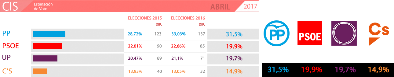 El PP perdería un punto y medio respecto al anterior estudio del CIS –en el que los populares ya retrocedían-, pero aún así seguirían siendo el partido más votado en unas elecciones según el centro sociológico. Obtiene un 31,5% en abril frente al 33,0% del CIS de enero.
