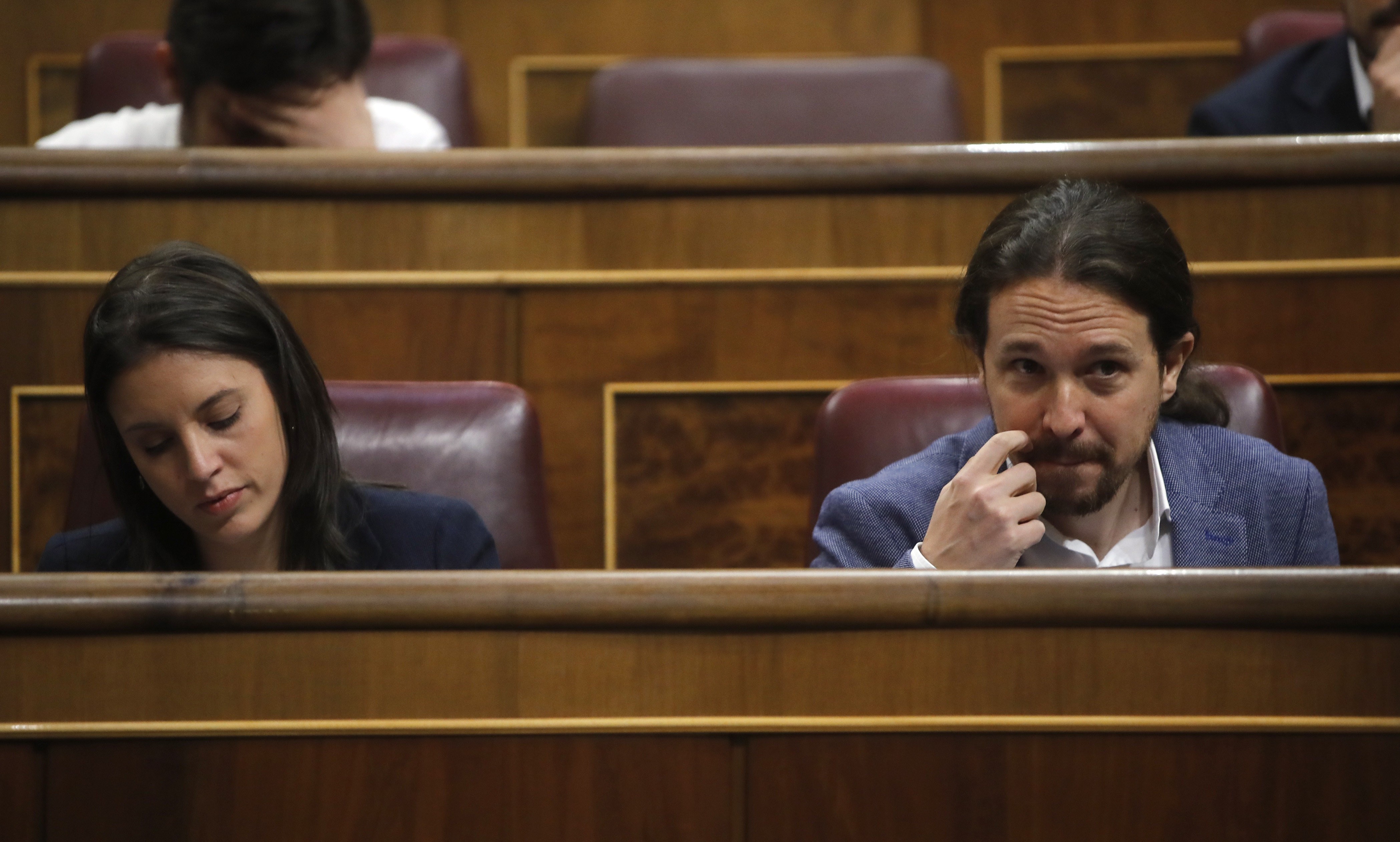 El líder de Podemos, Pablo Iglesias, y su portavoz, Irene Montero , durante el debate celebrado hoy en el pleno del Congreso de la moción de censura.