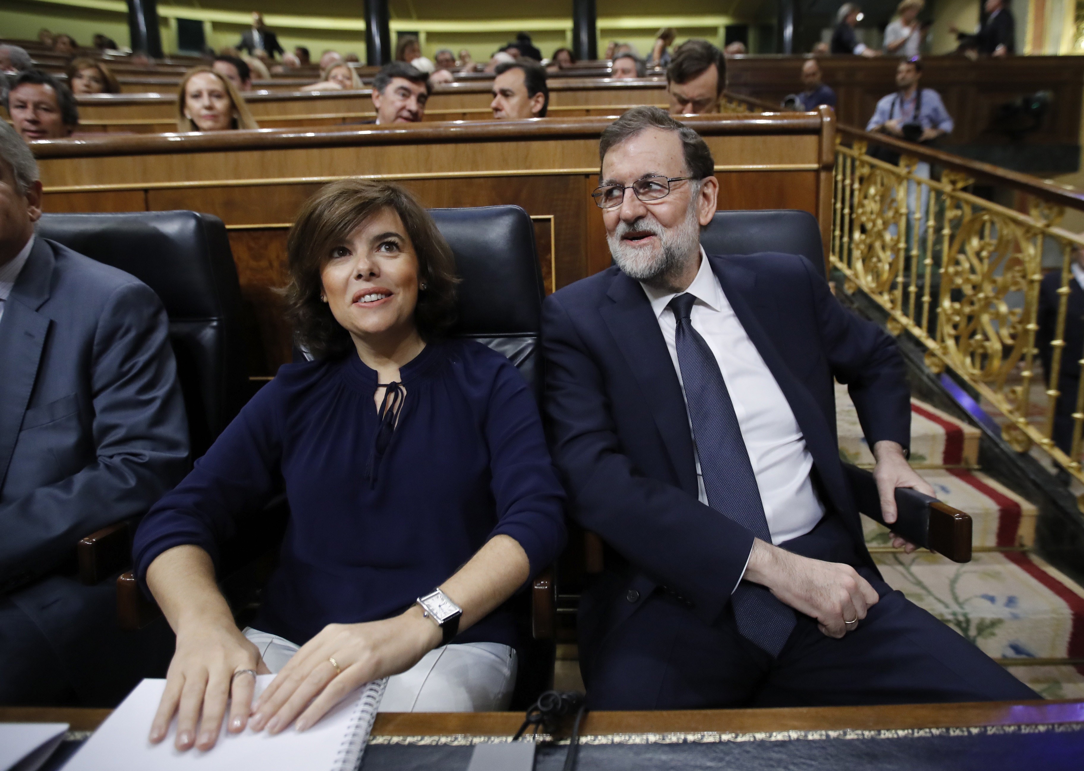 Soraya Sáenz de Santamaría, sentada al lado de Mariano Rajoy. La vicepresidenta del gobierno no ha intervenido durante la moción de censura.
